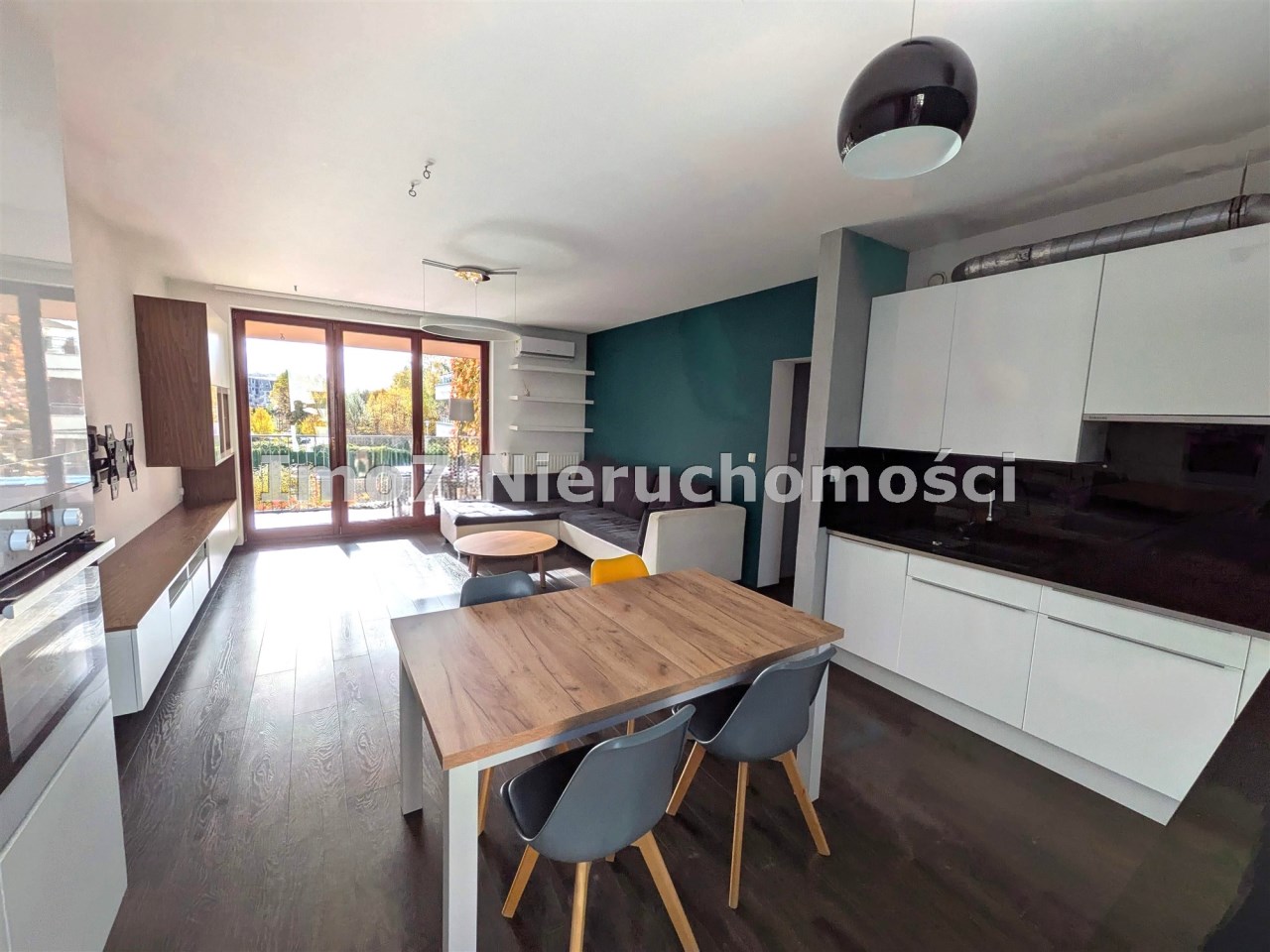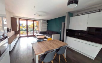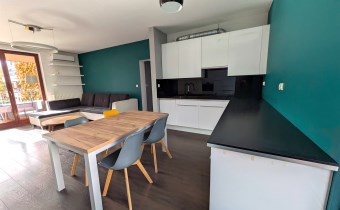 - przestronnego jasnego salonu połączonego z kuchnią i jadalnią, z wyjsciem na duży i słoneczny taras (8m2) z widokiem na zielony dziedziniec.